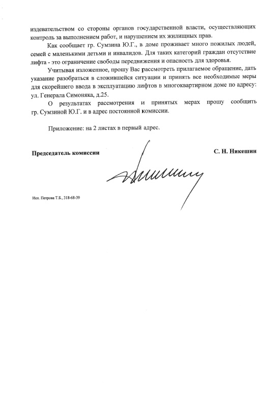 С ноября 2017 года в 7 подъездах дома в соответствии с Региональной программой капитального ремонта общего имущества в многоквартирных домах осуществляется ремонт и замена лифтового оборудования. Сроки выполения работ и сдачи лифтов неоднократно переносились. В связи с очередным переносом сроков включения лифтов мной, как председателем Постоянной комиссии по городскому хозяйству, градостроительству и имущественным вопросам, было принято решение направить письмо вице-губернатору Санкт-Петербурга Н. Л. Бондаренко с просьбой дать указание разобраться в сложившейся ситуации и принять все необходимые меры для скорейшего ввода в эксплуатацию лифтов в многоквартирном доме, расположенном по адресу: ул. Генерала Симоняка, д. 25.
