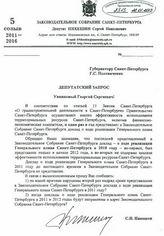 Последний доклад Правительства СПб о реализации Генерального плана СПб – за 2010 год – был представлен в Законодательное Собрание лишь в начале 2012 года и не содержал анализа эффективности использования территориальных ресурсов города. В связи с этим очередной запрос вашего депутата Георгию Полтавченко содержит просьбу сообщить, по какой причине второй раз подряд нарушены сроки представления в ЗС доклада о ходе реализации Генплана СПб в 2011 году, и когда соответствующие документы за 2011 и 2012 годы будут направлены законодателям Северной столицы.