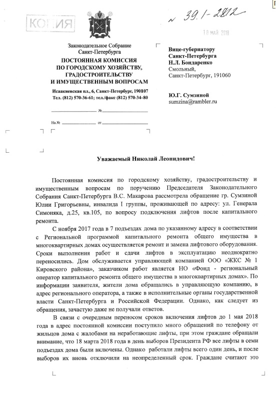 С ноября 2017 года в 7 подъездах дома в соответствии с Региональной программой капитального ремонта общего имущества в многоквартирных домах осуществляется ремонт и замена лифтового оборудования. Сроки выполения работ и сдачи лифтов неоднократно переносились. В связи с очередным переносом сроков включения лифтов мной, как председателем Постоянной комиссии по городскому хозяйству, градостроительству и имущественным вопросам, было принято решение направить письмо вице-губернатору Санкт-Петербурга Н. Л. Бондаренко с просьбой дать указание разобраться в сложившейся ситуации и принять все необходимые меры для скорейшего ввода в эксплуатацию лифтов в многоквартирном доме, расположенном по адресу: ул. Генерала Симоняка, д. 25.