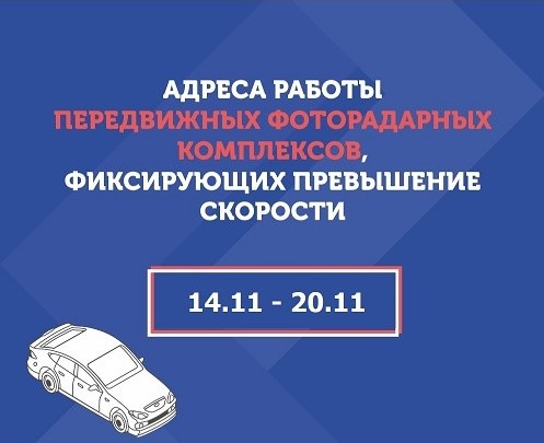 Адреса работы передвижных фоторадарных комплексов с 14 по 20 ноября, фиксирующих превышение скорости транспортных средств.