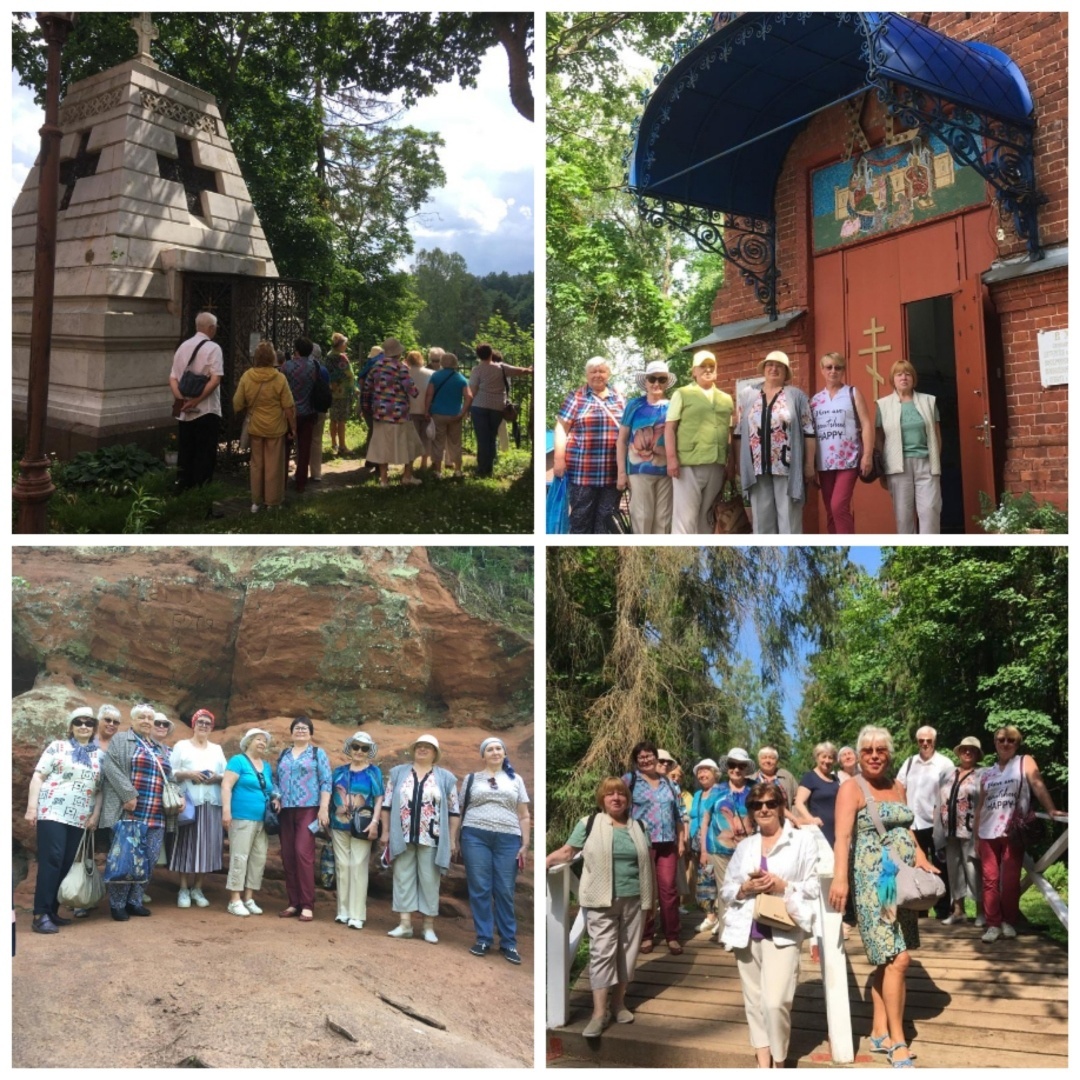 Участники экскурсии прогулялись по великолепному усадебному парку, который и по сей день сохранил старинную планировку. В парке уцелела его регулярная и пейзажная часть, за которой находятся самая большая в Ленинградской области карстовая пещера, а также купель, грот и святой источник, бьющий из скалы красноцветного песчаника. Вода из этого источника, по поверию местных жителей, обладает целебными свойствами. Воду периодически освящает священник из местного храма. Все набрали бутылочки со святой водой, а некоторые окунулись в купель.